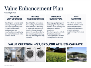 When assessing value-add investments in real estate syndications (which is the most common way investors can access value-add strategies), most investment materials will outline how the operator plans to add value to the investment – which is typically a mix of operational enhancements.